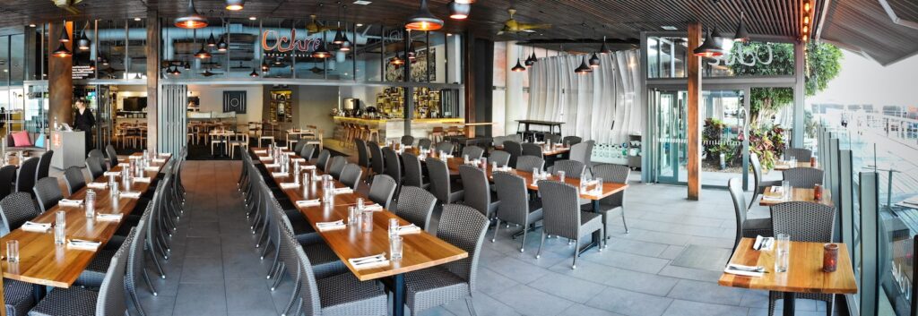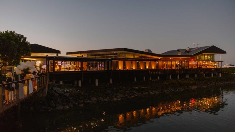 【初日の正解ディナー】 ケアンズで一番有名な水上レストラン&バー。オープンエアの席で、夕暮れの海風を感じながら乾杯。